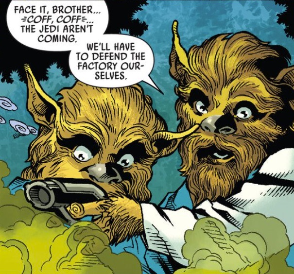 We’re talking Agricultural Hub 42 on Chortose, an Outer Rim planet full of cute little hairy werewolves. The Nihil have busted their way through the hub and are at the factory gates. A couple of Chortose brothers try to call the Beacon, but it’s too late. A smoke bomb gets thrown and the Jedi are nowhere to be seen. Looks like these two will need to fight the Nihil on their own!