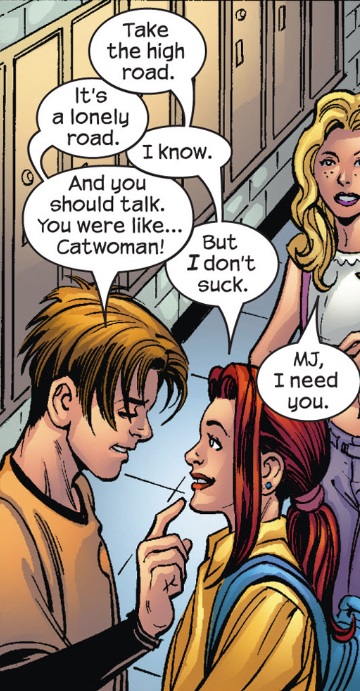 Speaking of angry, J. Jonah Jameson wants to speak to the young lad. And by “speak to” I mean “rant and throw staplers at”. He asks Parker if he remembers having “that talk” (the birds and the bees and the penises and the vaginas). The talk where Jameson actually lets his guard down and gives Parker words of encouragement? It happened! I just don’t remember the issue anymore to link to it. Oh well.