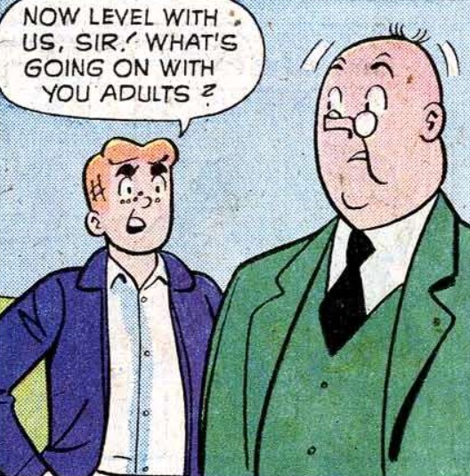Betty comes running to Archie out on the street, claiming that her father told her mother that the coffee “turned him on” and not in a sexy way! I guess in a 1975 way. And now Veronica’s coming own shrieking that her own father said he “didn’t know who he was”. It’s a veritable epidemic of the Silent Generation saying things not silently, but rather loudly. Things that are freaking out their Boomer kids.