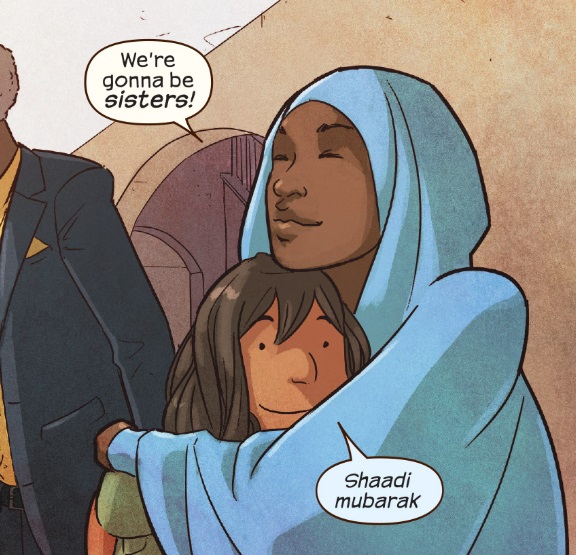 The melting girl causes a panicked ruckus at the house while Ms. Marvel is outside behind another house trying to shimmy out of her costume. The families run out the lawn screaming. Aamir is yelling things about God and Satan while Ammi throws her hands up to heavens asking where he daughter is. Kamala runs up garbed in her Sunday best like “I’m here! I’m here! I can explain! Hello, you must be Mr. Hillman, great tie, sir! It was just a science experiment! Hey look, a penny!” while Abu is losing his fucking mind. “You listen to me, young lady,” he spits. “The engagement party is tomorrow night, the nikkah a week later – if you are not present at these events, I will be utterly humiliated.”
